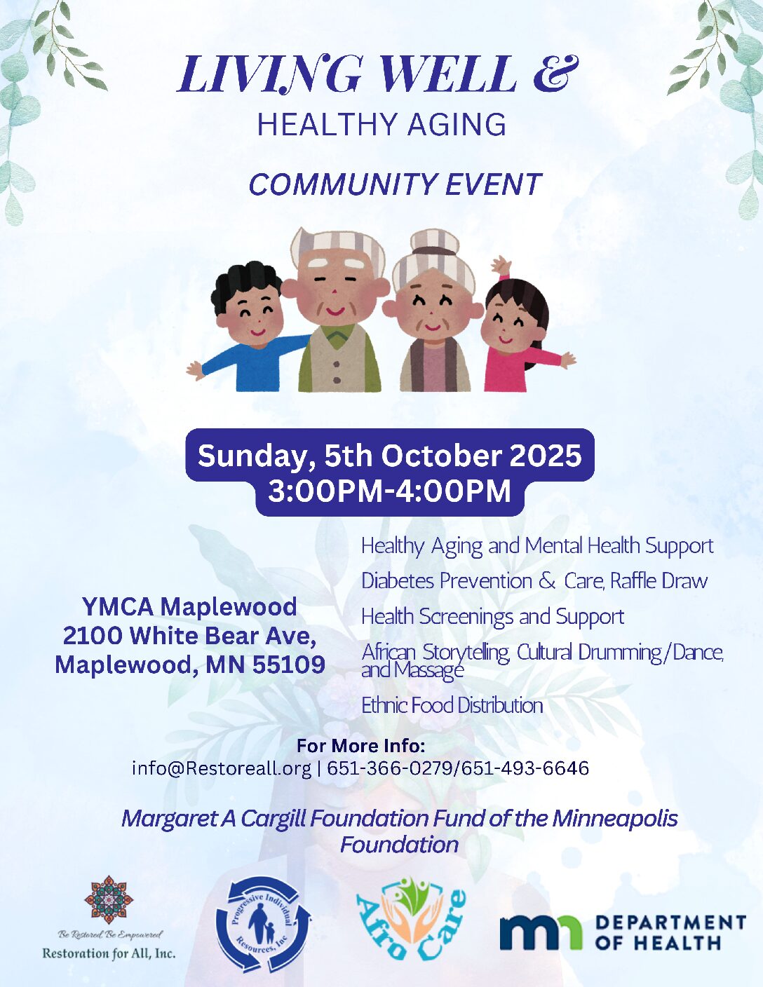 Conference Room 220 Robert St S, Saint Paul, MN, United StatesRestoration for All Inc. in partnership with Ramsey County, MDH, Afrocare Services & PIR is inviting you to join us for the Living Well: Elderly Cultural Fitness & Wellness Event to reclaim and revitalize the elderly culture of health and socio-cultural well-being. Resources & Education for Healthy Aging by Dr. Tolulope Ola & Dr. Richard [...]